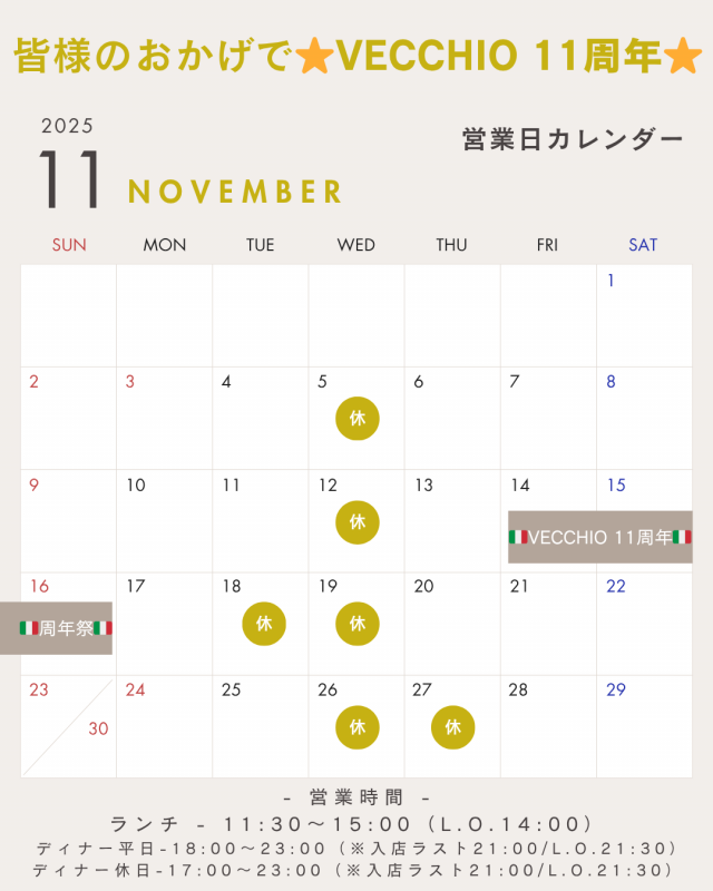 いつもご来店いただきありがとうございます!Vecchioは皆様のおかげで2025年11月14日をもちまして11周年を迎えることになります🙌🏻